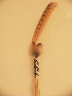 Gebetsfeder Uhu. Perlengriff gut 10 cm lang, verziert mit Uhuflaum und Stein beige. ***verkauft***