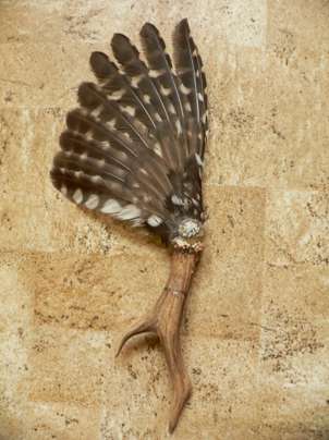 Waldohreulenfächer mit Rehhorn, verziert mit Eichelhäher-Deckfedern und Schneckenhaus
