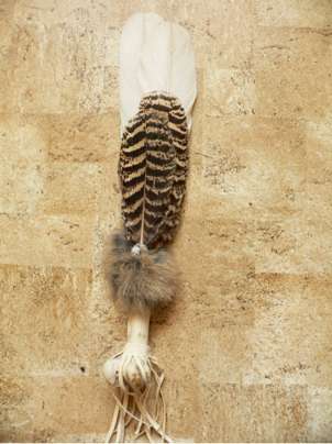 Storchen-Steuerfeder kombiniert mit Pfau Deckfedern, an Rehknochen befestigt, verziert mit Kaninchenfell und Schneckenhaus